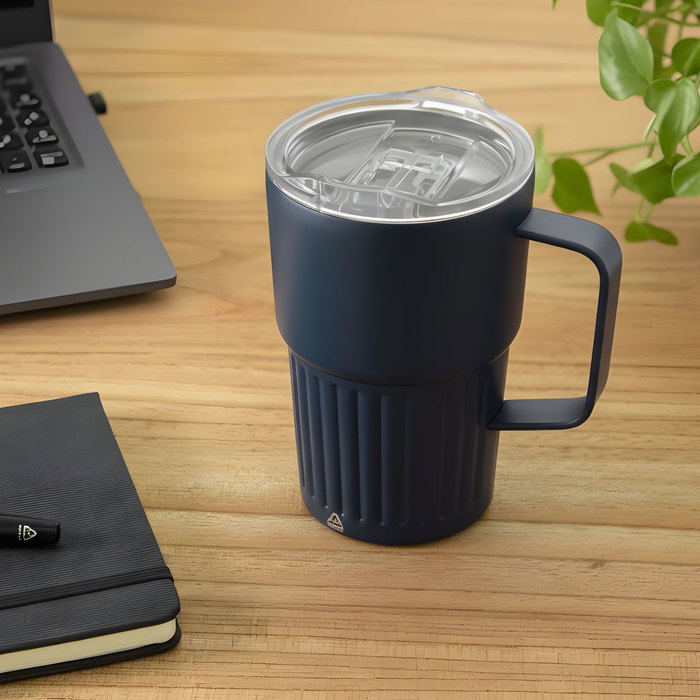 Mug doble pared con asa, sellado al vacío. Mug con aislamiento térmico. Tecnología vacuum. Interior en acero 304 reciclado y exterior en acero 201. Tapa de poliestireno con anillo de silicona. Asa metálica. Pintura acabado semi mate. Parte inferior texturada. Mantiene hasta 12 hs la temperatura de las bebidas calientes y 24 hs de las bebidas frías.